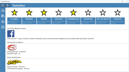 FUNKTIONEN UND FEATURES: - Über 25 spielerisch aufbereitete Lerninhalte - 3 zertifizierte Hypnotiseure stehen zur Auswahl - Vorbereitungshypnose - löse deine unbewussten Sorgen und Ängste auf - Nichtraucherhypnose - werde für immer freier Nichtraucher - Motivations-Check - Individuell auf dich angepasste App-Inhalte - sogar die Hypnose! - Erhalte Erfolge für das ansehen von Lerninhalten oder poste deinen Erfolg auf Facebook - Lass dir berechnen wie viel Geld du sparst und wie sich deine Gesundheit verbessert - Bis auf die Nichtraucherhypnose ist die gesamte App gratis und werbefrei - Diese kannst du für günstige 4,- Euro im Store freischalten - Die beste Investition deines Lebens! Egal ob Gelegenheitsraucher oder Kettenraucher, wenn du entschlossen bist mit dem Rauchen aufzuhören dann ist diese App die perfekte Unterstützung für dich!
