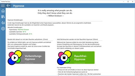 Wenn du wirklich entschlossen bist mit dem Rauchen aufzuhören, dann wirst du jetzt mit dieser App Erfolg haben! Viele liebevoll aufbereitete Lerninhalte und zwei Hypnosesitzungen unterstützen dich aktiv beim Rauchen aufhören, und lösen dein Rauchbedürfnis vollständig auf.