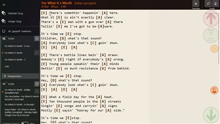 SongRepertoire hilft Dir als Musiker, Deine Noten, Texte, Web-Links, Playbacks und Setlists zu verwalten. Verwalte etwa mehrere Noten, Texte, Web-Links oder GuitarPro-Dateien und Playbacks bei einem Song. Texte und Noten können importiert werden (PDF, Text, Bilder, ChordPro, GuitarPro) oder mit dem integrierten Editor selbst geschrieben werden. Oder verwende die Kamera Deines Geräts, um Bilder von gedruckten Noten oder Notizen zu machen und zu importieren. Wenn bei den Texten das ChordPro-Format verwendet wird, kannst Du die Songs leicht transponieren. Pedale zur freihändigen Steuerung von SongRepertoire - wie zum Beispiel von Coda Music oder AirTurn - werden unterstützt. Mit Deinem Stift kannst Du bei bestehenden Dokumenten und Noten Notizen oder Anmerkungen hinzufügen. Du kannst aber auch ausgehend von entsprechenden Vorlagen Notenblätter oder Tabulaturen handschriftlich erstellen. Du kannst bei einem Song beliebige Playbacks verwalten oder mit Deinem Tablet oder Computer eigene Aufnahmen aufzeichnen. Für die Verwaltung von Set-Lists kannst Du sogenannte Playlists definieren und diesen Songs zuordnen. SongRepertoire erlaubt aber auch das Exportieren von Songs oder Playlists. So kannst Du Deine Inhalte auch ohne Cloud auf unterschiedliche Geräte verteilen oder mit Freunden und Band-Mitgliedern austauschen. Die Noten können auch als PDF exportiert werden, bzw. die Audioaufzeichnungen als MP3-Dateien. Bei PDF-Dokumenten und Bildern können die einzelnen Seiten direkt in SongRepertoire beschnitten oder gedreht werden.