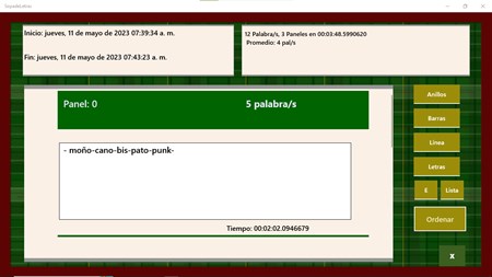BURBUJAS: muestra con anillos la cantidad de letras por panel. Sin números; solo verá como transcurrió el juego y si marcó mayor cantidad de palabras cambiarán los anillos.