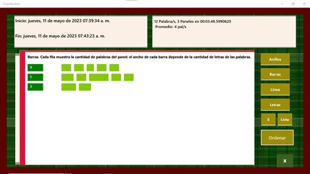 LETRAS: Un cuadro que presenta la cantidad de caracteres por letra. Tiene un formato si supera una cierta cantidad cambiará de color: negro, verde, naranja o verde fuerte. Este gráfico está disponible si primero visualiza BURBUJAS. Si pasa al panel de estadísticas sin haber confirmado paneles, no estarán disponibles. Ahora, puede ordenar la lista, de manera muy sencilla. Al finalizar visualiza las palabras de modo automático
