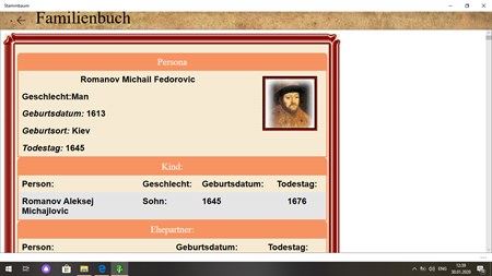 Die Anwendung wurde erstellt, um das historische Erbe der Familie zu speichern. Führt eine Liste der Personen und ihrer familiären Bindungen, Fotos, Kopien von Dokumenten und Videos. Zeichnet Bäume auf einer Grafik- und Hypertext-Leinwand. Speichert Fotos und Videos. Zeigt einen Kalender mit Familienereignissen an, mit dem die Tage wichtiger Familienereignisse visuell angezeigt werden können.