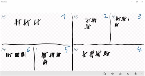 Diese App simuliert eine einfache, interaktive Strichliste. Es werden alle geraden Striche, die mit dem Stift oder dem Finger bzw. der Maus auf den Schirm gezogen werden gezählt. Man kann den Schirm durch lange Striche in mehrere separate Strichlisten aufteilen. Jede dieser Listen kann dann wieder durch einen langen Strich geteilt werden.