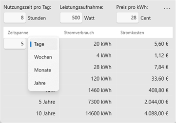Das Programm rechnet zudem verschiedene Zeitspannen durch, sodass Sie gleich sehen können, ob sich die Anschaffung eines energieeffizienten Elektrogerätes lohnen würde. Oder Sie stellen sogar fest, dass einige Geräte gar nicht so viel verbrauchen, wie Sie zunächst dachten.