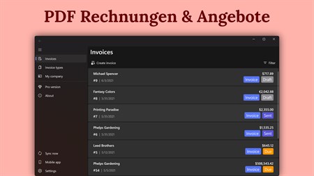 • Verfügbar für alle Plattformen inkl. Cloud-Sync (OneDrive, Google Drive, Dropbox, iCloud, WebDAV) • Schreibe Rechnungen auf allen Deinen Geräten - PC, Laptop, Tablet & Smartphone • Ganz einfach PDF Rechnung oder Angebot erstellen & Kunden zusenden • Erstelle Rechnungen aus deinen WorkingHours Daten mit nur einem Klick • Rechnungen verwalten: markiere sie als bezahlt, sobald sie beglichen werden • Schöne & anpassbare PDF-Vorlagen - wähle Dein bevorzugtes Layout • Personalisiere die PDF Rechnung mit deinem Unternehmens-Logo, -Farbe & -Schriftart