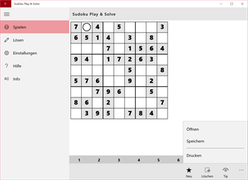- Das aktuelle Spiel wird immer gespeichert und kann damit beim nächsten Start fortgesetzt werden. - Spiele könne gespeichert, und gedruckt werden - auch mit Windows 10 Smartphones. - Kopieren in die Zwischenablage: fügen Sie das Spielfeld in Word, E-Mail, etc. ein - Optional werden fehlerhafte Eingaben farbig hervorgehoben (Einstellungen)