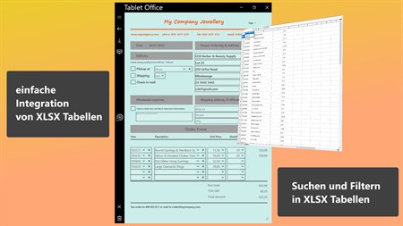 Eingabefelder haben Zugriff auf XLS-Dateien. Klappfelder mit vordefinierten Werten können für Text-Eingabefelder verwendet werden. Die Dokumente können als email versendet werden, in Cloud-Speicher hochgeladen oder direkt gedruckt werden.