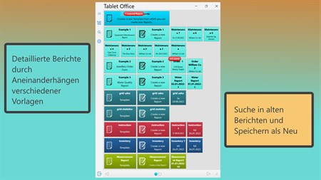 Tablet Office verwendet benutzerdefinierte Vorlagen für wiederkehrende Berichte. Es unterstützt Rechnungen, Lieferscheine, Wartungsprotokolle, Status-Reports, Logbücher, Mängelberichte, einfache Notizen. Inklusive Exportfunktionen für Datensammlung und Archivierung. Reports können durch Aneinanderhängen verschiedener Vorlagen zusammengestellt werden.