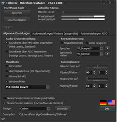 Die Sprechlautstärke für das Mikrofon ist frei konfigurierbar, ebenso die Geschwindigkeit der Fadevorgänge (Ein- und Ausfaden ist getrennt konfigurierbar).