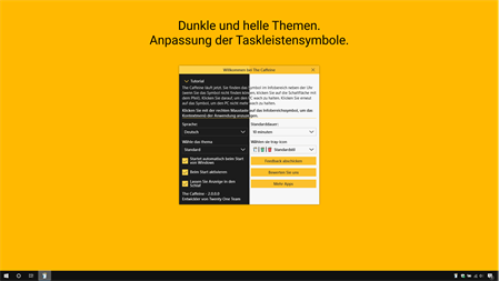 The Caffeine - die beste Anwendung für Ihren PC. Die Anwendung hilft Ihnen bei langwierigen Aufgaben wie Rendern, Herunterladen und Mining. The Caffeine ist dein Leben leichter. ⭐ Funktionen ⭐ ✔ Halten Sie Ihren PC für lang laufende Aufgaben wach. ✔ Fahren Sie Ihren PC nach einer bestimmten Zeit herunter. ✔ Benutzerdefinierte Zeit zum Wachen und Herunterfahren. ✔ Einfach zu bedienen. ✔ Wartungsarm. ✔ Dunkle und helle Themen. ✔ Anpassung der Taskleistensymbole.