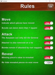You can play with the standard rules or change any of the various rule options to suit your play. The Artificial Intelligence of the various computer controlled opponents is very strong so you'll have to fight deviously to win!