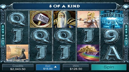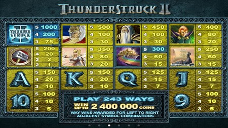Ascend to the realm of Asgard in search of the mythical top prize worth more than €121,000 in 243-way video slot, Thunderstruck II. Wilds, random wilds and a selection of bonus modes await. Play for free with bets ranging from €0.30 to €15 per spin. Thunderstruck II offers maximum win on a single bet over €121,000, 5 reels and 243 bet ways. If you’re a fan of innovative bonus modes, you’ll love Thunderstruck II and its multiple bonus rounds. Match three or more hammer scatters, and you’ll be given a choice of up to four bonus modes, depending on how many times you’ve accomplished this. Each bonus mode has its own unique features and number of free spins. Wilds can substitute for any regular symbol, and random wilds also occur. Match three or more Wilds to win up to €50, or three or more Thors to win up to €25.
