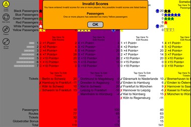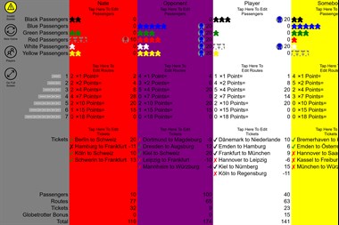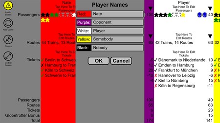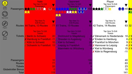 This is a scorekeeping app for the boardgame Ticket To Ride: Germany. Features include score calculation & validation. Users can specify the number of passengers collected, which tickets have been chosen, and what routes have been claimed. Routes claimed are selected using a visual map which displays the routes claimed by all players. All scores are dynamically updated. Users with smaller screen sizes may not be able to see details for all scoring components at the same, but will have the option of expanding or collapsing each section while editing score input.