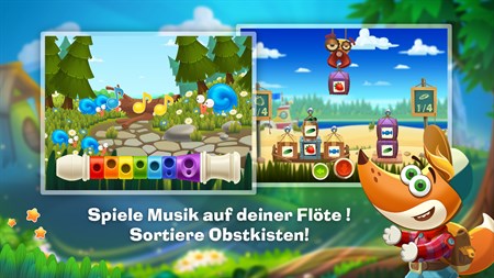 Tim the Fox's Travel ist ein lustiges, buntes Spiel, indem der Spieler einem kleinen Fuchs auf einer Reise hilft, Herausforderungen bewältigt werden wie durch Dickicht navigieren und Flüsse überqueren, einen Ausweg aus trügerischen Irrgärten finden, Matheaufgaben lösen und andere interessante Ziele. Auf dieser magischen Reise trifft Tim the Fox gute Freunde, auf wunderschöne Orte wie eine sonnige Lichtung und einen sandigen Strand, macht Sport beim Aufladen von Gemüse und spielt Melodien auf einer Flöte mit einer Note nach der anderen. Das Spiel hilft Kindern bei der Entwicklung von Logik, Gedächtnis, Mathefähigkeiten, Aufmerksamkeit und selektiver Wahrnehmung. Perfekt für Kinder zwischen 5 und 8 Jahre, von Vorschulkindern bis zu Erst- und Zweitklässler.