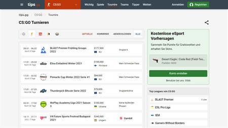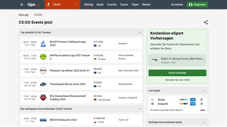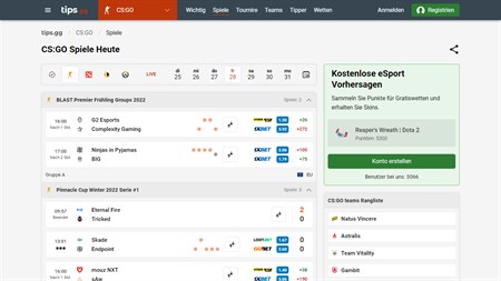 Tips.gg ist ein einzigartiges eSport-Webseite. Setzen Sie kostenlose Vorhersagen für Spiele, sammeln Sie Punkte und tauschen Sie diese gegen wertvolle Preise ein. Analysieren Sie den eSport mit tips.gg: Spielplan, Ergebnisse, Turniere, Teams – alle Sportarten auf einer Webseite.