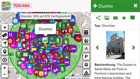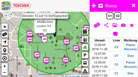 Es zeigt Ihnen alle Angebote an, die es in Ihrer Nähe oder an einem von Ihnen gewählten Ort gibt. Sie finden Restaurants, Bäder, kostenloses WLAN, Fahrräder, Parkanlagen, digitale Standorte, Verspätungen von Bussen, Parkhäuser, Apotheken, Geldautomaten, usw. Es gibt ortsgebundene Dienste zu Verkehr und Mobilität, Kulturerbe, Krankenhäuser, Wetterdienste, Dienstleistungen, Bushaltestellen und Wartezeiten, Banken, digitale Standorte, Energie und vieles mehr, in Bild, Freiraum parching, Treibstoffpreise, Ton und Dokumenten. Die verfügbaren Daten finden Sie über http://www.disit.org/6726 und es gibt ungefähr 100.000 Angebote in Florenz, Pisa, Prato, Pistoia, Arezzo, Empoli und in der gesamten Toskana. Sie beziehen sich auf die gesamte Toskana, insbesondere auf das Umland um Florenz. Sie kommen von der MHC der Region Toskana, von LAMMA, von der Verkehrsbeobachtung und -verwaltung, von der Kommune Florenz usw. Public services: afat, ctt, cap, tiemme, amvbus, tft, vaibus, blubus, etruria mobilità, siena mobilità, cpt, trenitalia, gest, toremar.