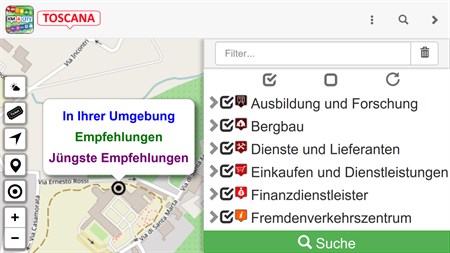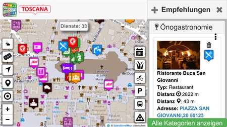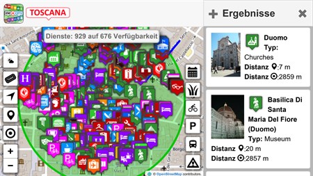 Auf Km4City sind zahlreiche Informationen über die Kommune Toskana und über Florenz verfügbar, http://www.km4city.org, und für die Entwickler http://servicemap.disit.org . Km4City ist eine skalierbare und effiziente Lösung für die Bereitstellung innovativer Dienste in schnellen und unentschlossenen Zeiten (i). Es stellt integrierte/komplexe Daten bereit und (ii) ermöglicht die Verbindung von privaten oder spezifische Daten mit offenen Daten; Dienste mit einfachen und effektiven API zur Entwicklung von mobilen und Web-Anwendungen, die auf kohärente Weise Daten verwenden und konstant komplexe, aktuelle Daten liefern. Km4City umfasst Entwicklungs- und Herstellungstools und basiert auf dem Km4City-Modell (http://www.disit.org/km4city) sowie auf einer Reihe neu entwickelter Tools, die momentan im Aggregator von Florenz im Gebrauch sind, entwickelt von DISIT Lab, verfügbar über http://servicemap.disit.org (auch mit API verfügbar). Die Lösung Km4City basiert auf dem nationalen Projekt Sii-Mobility smart city sowie dem Projekt RESOLUTE H2020. Die Anwendung Km4City misst in der Stadt Wi-Fi- und BT-Signale und übermittelt diese an einen zentralen Server in vollständig anonymisierter Form, um die Quellen in der Stadt zu abzubilden. Die Anwendung bietet Vorschläge basierend auf dem ausgewählten Benutzerprofil (Bürger, Pendler, Student, Neutral und Tourist). Auch hier greift die Anwendung nicht auf personenbezogene Daten zurück, um Sie zu identifizieren, sondern allein auf Ihr allgemeines Profil, ohne dabei auf Ihre persönlichen Daten zuzugreifen, das heißt also, unter Berücksichtigung der Privatsphäre.