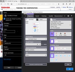 Toshiba Print Experience (“Applikation”) stellt Druckfunktionen zur Kontrolle von TOSHIBA e-STUDIO Multifunktionsdruckern (“MFP”s) zur Verfügung. Diese Applikation ermöglicht die Konfiguration detaillierter Einstellungen, wenn Sie aus Apps von Windows Store ein Dokument drucken. Mit dieser App können Sie auch die Konfiguration von Optionen Ihres MFPs betrachten. Zu weiteren Einzelheiten siehe Hilfemenü innerhalb der Applikation. Bevor Sie diese Applikation nutzen können, müssen Sie den “Toshiba V4 Druckertreiber” auf Ihrem PC installieren. Bitte lesen Sie unbedingt die “Readme” des Toshiba V4 Druckertreibers, um Kenntnis über die unterstützten Modelle und weitere Themen zu erhalten. Die Installation und Nutzung dieser Applikation setzt voraus, dass Sie die Bestimmungen und Bedingungen des Endbenutzer-Lizenzvertrags (“EULA”) akzeptieren. Bitte lesen Sie die EULA aufmerksam, bevor Sie diese Applikation nutzen oder installieren. WENN SIE DIE BESTIMMUNGEN UND BEDINGUNGEN DER EULA NICHT AKZEPTIEREN, DÜRFEN SIE DIESE APPLIKATION WEDER INSTALLIEREN NOCH KOPIEREN ODER NUTZEN. Hinweis: Toshiba TEC erfasst mit dieser Applikation keine personenbezogenen Daten, auch keine Scan- oder Druckdaten.
