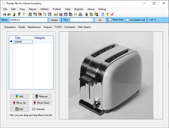 Tracker Ten for Home Inventory is a full-featured database system that tracks your household items, including art work, electronics, jewelry, furniture, collectibles and much more. You can use the software for tracking items for insurance, warranty and organizational purposes. You can also keep track of product manual PDF's and receipt scans in the image area. Tracker Ten for Home Inventory incorporates a powerful search engine, a versatile report writer, easy data entry, context sensitive help, full customization, data graphing, an album view, a spreadsheet view, multiple image support, and much more. Using the software you can easily generate full color reports with pictures of all of your valuables, great for insurance record keeping. The software is extremely easy to use.