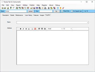 Tracker Ten for Instruments is a full-featured database system that tracks all types of musical instruments. It is ideal for personal collections, schools, bands and more. You can use the software to easily organize and track your inventory, and to maintain detailed maintenance records. The software also has a loan tracking area to keep track of instrument loans. The software features advanced reporting, graph generation, data export, a powerful search engine, full customization, optional web publishing and more. The software can also generate full color reports, incorporating images, great for accurate insurance record keeping.