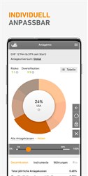 Wir legen uns fest, damit Sie es nicht müssen • Depot eröffnen und Anlagestrategie bestimmen in unter 30 Minuten. • Testen Sie alle Funktionen im virtuellen Konto ohne einen Rappen echtes Geld. • Keine Mindestlaufzeit. Kündigung jederzeit möglich. Sie verfügen über Ihr Vermögen.