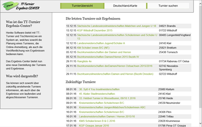 Das TT-Turnier ErgebnisCenter ist ein öffentliches Portal für die Veröffentlichung von Tischtennis Turnieren. Es werden sowohl Turniere angekündigt, zu denen man sich online anmelden kann, als auch live aktuelle Ergebnisse übermittelt.