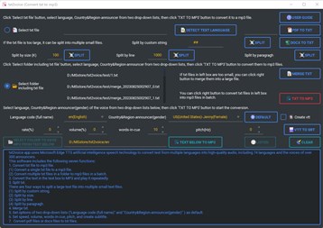 txt2voice app uses Microsoft Edge TTS artificial intelligence speech technology to convert text from multiple languages into high-quality audio, including 74 languages and the voices of over 300 announcers. If click the "User Guide" button in the upper right corner of the interface, the webpage of the software usage instructions will be opened on the new tab of the default browser. This software includes the following seven functions: 1. Convert txt file to mp3 file. (1) Convert a single txt file to a mp3 file. Click "Select txt file" button in the upper left corner of the interface. If you are unsure of the language, please click "DETECT TEXT LANGUAGE" button on the right to detect the type of text language based on the first few lines of the selected txt. Then select the language type from two drop-down lists (the first is "Language code (full name)", and the second is "Country&Region-announcer(gender)") based on the detection results. When clicking "TXT TO MP3" button on the right side of the interface (Note: the computer must be able to connect to the internet), you can convert the selected txt file into a mp3 file and save it in the selected folder. When the conversion of txt to mp3 is completed, a dialog box "Convert txt to mp3 successfully!" will pop up, displaying 'The saved mp3 filename is the selected txt filename plus timestamp (year, month, day, hour, minute, and second in Arabic digits)'. (2) Convert multiple txt files in a folder to mp3 files in a batch. If you want to convert multiple txt files, you can place them in a folder and click "Select folder including txt file" button to import all txt files in the folder into the list box on the right. If you need to add or delete text file in the list box, you can right-click and select "Add" or "Delete". When clicking "TXT TO MP3" button, all txt files in the list box are automatically converted into mp3 files in a batch and saved in the selected folder. When all conversions are completed, a "Convert all txt files to mp3 files successfully!" dialog box will pop up, displaying "The saved mp3 filename is the selected txt filename plus timestamp (year, month, day, hour, minute, and second in Arabic digits)".