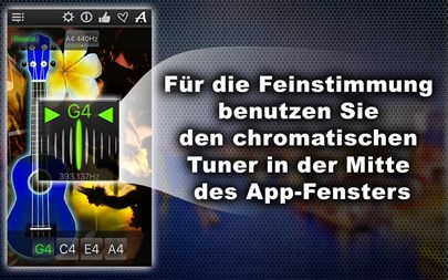 App-Highlights: * Chromatic Tuner mit Audio-Eingang- und Mikrofon-Unterstützung, * Tongenerator mit dem Original-Klang einer hawaiianischen Ukulele, * Automatische Wiederholung vom Tönen, * 11 Tonstufen: + Baroque, + Scientific, + France1859, + New Philharmonic, + Concert Pitch, + Boston Symphony Orchestra, + New Berliner Philarmoniker, + Moscow Theater, + Old Berliner Philharmoniker, + Old Philharmonic, + Renaissance.