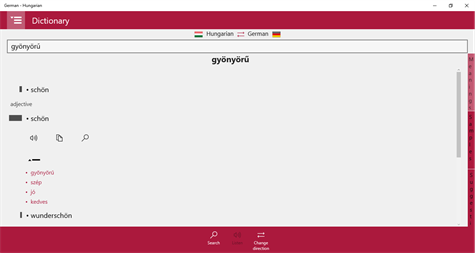 • Deutsch → Ungarisch 68.000 Wörter und Sätze. • Ungarisch → Deutsch 61.000 Wörter und Sätze. • Test, Flashcard, hören Test, schreiben, Dual-Spiel und mehr ... • Deutsch ↔ Ungarisch Übersetzer (online). Sie können Text übersetzen und zu hören. • 800 phrasen