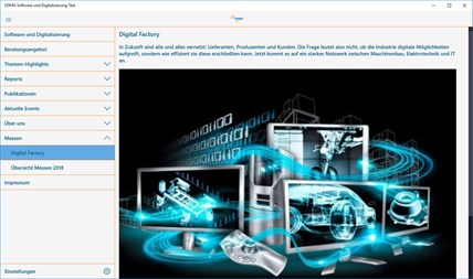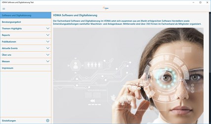 Diese App beinhaltet Informationen des VDMA Fachverbands Software und Digitalisierung zu aktuellen Trendthemen der Digitalisierung im Maschinenbau, Softwaretechnologien, zu Arbeitskreisen und unterschiedlichen Events. Die App beinhaltet außerdem aktuelle Aktivitäten des Fachverbandes auf verschiedenen Messen (Hannover Messe, sps ipc drives, AMB) mit Informationen zu einzelnen Podiumsdiskussionen und Foren. Dies wird unterstützt durch integrierte Kurzumfragefunktionen sowie vom Anwender einzurichtenden Push-Nachrichten zu individuell bestimmbaren Themengebieten.