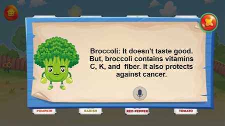 - Educational gameplay that teaches kids about vegetables - Fun and engaging storyline - Easy-to-learn and play - Suitable for kids of all ages