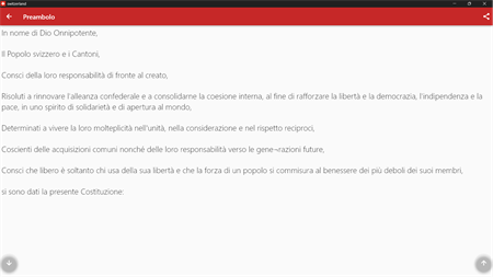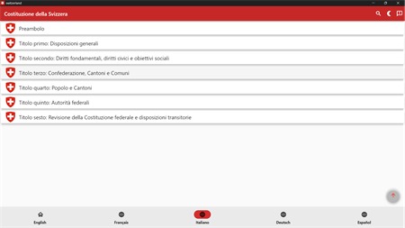 Diese Anwendung enthält die Verfassung der Schweiz in Englisch, Französisch, Italienisch, Spanisch und Deutsch.