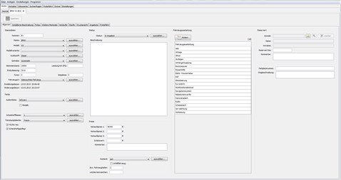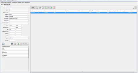 Das Programm erfasst im Detail alle vorhandenen Fahrzeuge. Für jedes Fahrzeug können solche Daten wie Marke, Modell, Bautyp, Kilometerlaufleistung, Motorleistung, Farbe und vieles anderes hinterlegt werden. Viele Eingabefelder sind als Listen aufgebaut, in die man neue Daten einführt hat, die später direkt daraus benutzt werden können. So kann jedem Fahrzeug ein eigener Status zugeordnet werden, die Liste zugänglicher Werte kann vom Anwender definiert werden. Man kann mehrere Verkaufspreise einfügen. Für jedes Fahrzeug kann man eine Ausstattung eingeben, indem man im Detail alle Komponenten hinzufügt. Zu jedem Auto kann eine unbegrenzte Anzahl Fotos hochladen. Für jedes Fahrzeug kann man Informationen über Kauf und Verkauf, Käufer, Verkäufer, Preis und Verkaufsbedingungen einfügen. Alle Hauptangaben zu dem ausgesuchten Fahrzeug kann man ausdrucken oder im PDF-Format speichern.