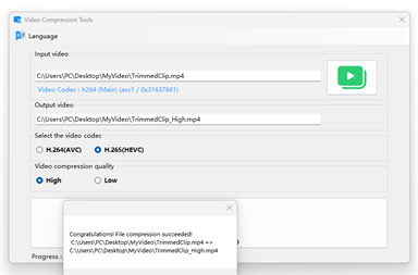 What if the computer memory is getting smaller and smaller? Want to save your PC memory on Windows PC devices? This APP provides two video codecs (H.265/HEVC, H.264/AVC) and two (high and low) video compression modes to compress your video, optimize memory and retain high-definition original images. The combination of H.265/HEVC and low-quality compression can be compressed into the smallest memory. After selecting a video file, you can view the corresponding video codec. After selecting a video file, we will add "_High, Low.mp4" to the original file name as the new name of the output video. Of course, you can rename it.