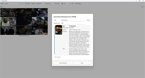 This application scans one or more folders for video files and generates tiled image previews for each video file. You can browse each scanned folder separately and you can play the videos by double-clicking on the previews. The default media player configured in your system is used for playback. The size of each video preview and the rows/columns of tiles per preview are configurable in Settings. The application supports tagging each file with custom tag categories and values to store useful information. You can sort the videos and search by filename and/or specific tag values. You can also search for any movie metadata available on TMDB and import these metadata as tags associated with each file. This application does not support Windows 10 S.