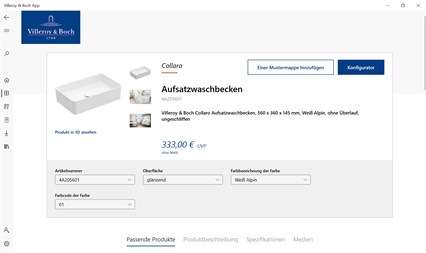 Die neue Villeroy & Boch App – entwickelt für professionelle Installateure und Badplaner. Jetzt haben Sie alle Infos rund ums Bad schnell zur Hand: aktuelle Preise, Maße, Montageanleitungen und vieles mehr. Konfigurieren Sie zum Beispiel mit Ihren Kunden die gewünschte Produktausstattung und schauen Sie gleich, ob der Artikel verfügbar ist. Oder überzeugen Sie Ihre Kunden mit einer 360°-Ansicht des Waschbereichs. Ob im Showroom oder unterwegs – die neue Villeroy & Boch App ist das smarte Werkzeug für Ihre Planung und Beratung.