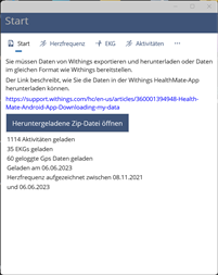 Die Daten für die App stammen aus dem Export, den Sie in Ihrem Withings-Konto starten können. Laden Sie die Zip-Datei mit den Daten herunter und öffnen Sie die Zip-Datei in der App. Die Zip-Datei enthält alle Daten, die jemals für Ihr Withings-Konto aufgezeichnet wurden, und alle Daten können in der App angezeigt werden.