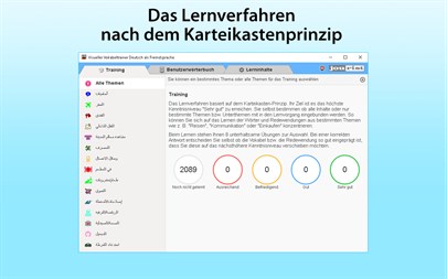 Der Vokabeltrainer „Deutsch als Fremdsprache“ ermöglicht die Auswahl aus folgenden Ausgangssprachen für das individuelle und komfortable Lernen: Englisch, Französisch, Spanisch, Italienisch, Portugiesisch (Brasilien), Tschechisch, Arabisch, Russisch, Türkisch, Chinesisch, Japanisch, Persisch und Polnisch.