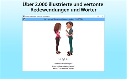Die einzigartige Methodik vereint die visuelle und akustische Wahrnehmung der deutschen Sprache: Zu jeder der über 2 000 von professionellen deutschen Sprechern vertonten Vokabeln und Redewendungen bietet die App eine einprägsame Illustration.