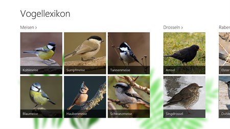 33 häufige Garten- und Feldvögel in Wort, Bild und Ton sollen dem Vogelbeobachter einen kurzen und prägnanten Überblick über die heimischen Vogelarten geben. Die App lässt sich ohne Internetverbindung betreiben und eignet sich durch die bebilderte Übersichtsseite für das schnelle Auffinden der beobachteten Tiere etwa in der freien Natur oder am Futterhaus.