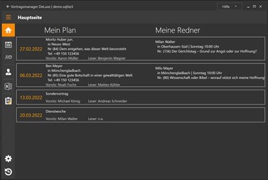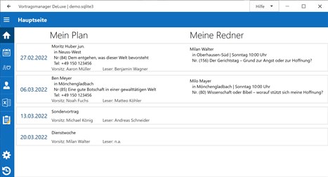 Dieses Programm ist für Vortragskoordinatoren von Jehovas Zeugen konzipiert worden. Es hilft dir bei der Planung deiner Vorträge unter Berücksichtigung wann ein Redner das letzte mal eingeladen war und wann der entsprechende Vortrag das letzte mal gehört wurde etc. Außerdem können damit die eigenen Redner sowie Einteilungen für WT Leiter und Leser verwaltet werden.