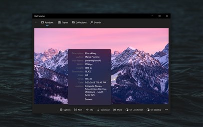 Wall Splatter is a native Unsplash client designed just for Windows. It allows you to easily find wallpapers by collection, topic, or search. From there, you can quickly save wallpapers, share them, view detailed metadata, or set them as your Lock Screen or Desktop background.