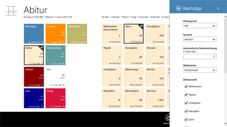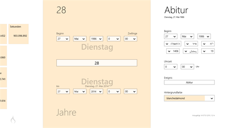Einfache App zur Berechnung des Alters aufgrund eines Datums bzw. Errechnung eines Datums anhand eines Alters; für Geburtstage, Hochzeitstage, Gedenktage und sonstige Ereignisse. Finde einfach immer einen ausreichenden Grund zum Feiern oder Trauern!