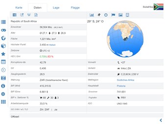 Weltatlas, Weltkarte und Lern-App für Geographie und Erdkunde. Flaggen, Positionskarten und Basisdaten und Karten zu mehr als 260 Staaten, Ländern und Territorien der Welt. Politische Karten und umfangreiche wirtschaftliche und statistische Länderdaten zu allen Ländern Afrikas.