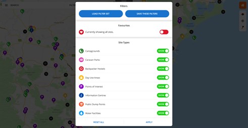 Use site filters to narrow down your results and only show sites which are relative to your needs. Eg. Must have toilets, must be pet friendly, has power available, etc.