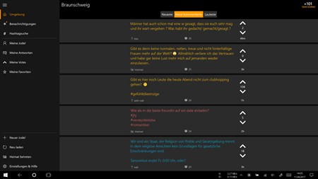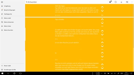 Zusätzlich synchronisiert die App Deine Daten zwischen all mehreren Geräten was bedeutet, dass Du all Deine Jodel, all Deine Up- und Downvotes und all Dein Karma auf all Deinen Windows 10-Geräten hast (erfordert das eingeloggt sein mit dem gleichen Microsoft-Account auf allen Geräten sowie einen OneDrive-Account).