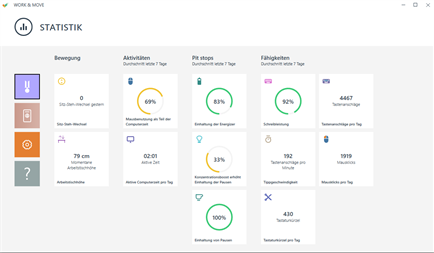 WORK & MOVE ist der persönliche Coach, der für genügend Abwechslung zwischen Bildschirmarbeit und mentaler und physischer Beweglichkeit sorgt. Mit dieser Software erhalten Sie Einblick und ein Feedback über Ihr Verhalten am Computer. Auf Grundlage Ihrer persönlichen Bedürfnisse schlägt die Software einen optimalen Arbeits-Bewegungs-Ruhe-Rhytmus vor und hilft Ihnen, sich diesen anzueignen. Regelmäßige geistige und physische Bewegung führt zu mehr Konzentration und Energie, sodass weniger Fehler auftreten und die Qualität der Arbeit verbessert wird. WORK & MOVE wird standardmäßig mit einer 30-Tage-Testlizenz ausgeliefert. Wenn Sie über eine Produktionslizenz verfügen, können Sie diese nach der Installation auswählen.