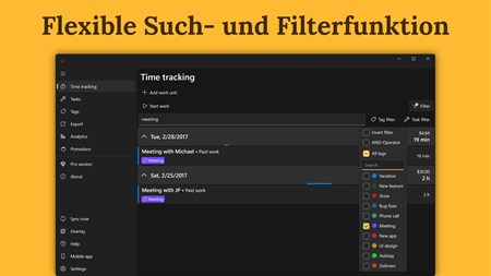 • Cross-Platform Arbeitszeiterfassung für alle Geräte (Android, Windows, iOS, macOS) inkl. Cloud-Sync* • Verwende Deinen eigenen Cloud-Speicher für die Synchronisation (OneDrive, Google Drive, Dropbox, iCloud, WebDAV) • Starte/Pausiere/Stoppe deine Arbeitszeit, ohne die App zu öffnen, z.B. via Benachrichtigung oder Mini-Fenster* • Nachträgliche Anpassung der Arbeitseinheiten um Fehler zu korrigieren • Zuweisen von Aufgaben oder Tags zu Arbeitseinheiten • Daten-Export als Excel-Arbeitszeittabelle, CSV-Datei oder PDF-Rechnung* • Automatisches Starten und Stoppen bei Arbeitsplatz-Ankunft und -Abfahrt • Spezial-Tags erlauben Anpassungen der Arbeitszeit oder Einnahmen • Arbeitseinheiten nach Tags und Aufgabe filtern • Analysiere Arbeitszeit und Einnahmen in Diagrammen mit versch. Zeitspannen • Integration in Systemkalender & "Diarium"-Tagebuchapp • Sei produktiv mit der Pomodoro Technik - WorkingHours erinnert dich, wenn du eine Arbeitseinheit abgeschlossen hast