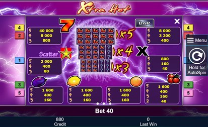 This is one hot and fruity classic slot! Play Xtra Hot to land amazing cash winnings. Just one game can multiply your account balance with juicy fruit wins. With five reels and five paylines this easy to follow slot has win patterns beginning on the first reel on the left and follows the payline across to the right. Your goal is the have every reel show the same symbol, however, the Star scatter symbol can appear anywhere. What are you waiting for? Spin those fruit-filled reels!