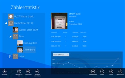 Ihre Daten können Sie auf OneDrive sichern und von dort wieder zurückladen. Eine Liste der Zählerstände können Sie für weitere Auswertungen als CSV-Datei abspeichern. Vorhandene Zählerstände aus zuvor genutzten Apps oder aus Excel können bei der PC-Version per CSV-Datei importiert werden.